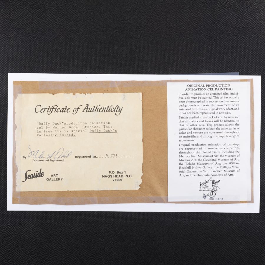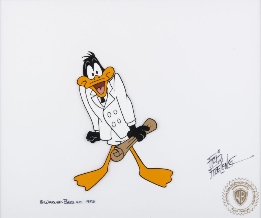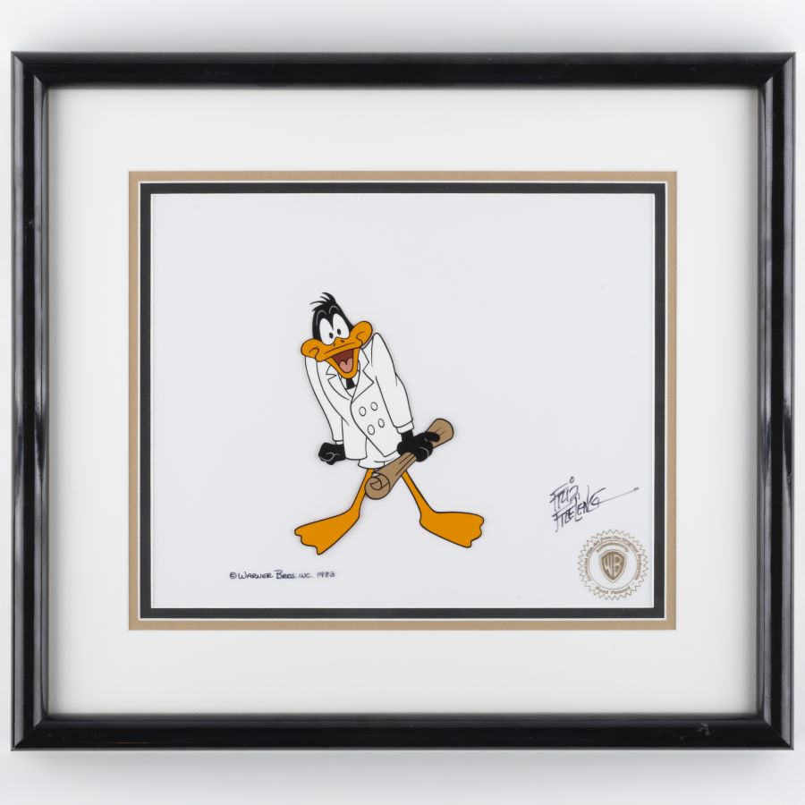 A production cel from the Warner Bros. Studios animated film “Daffy Duck’s Fantastic island” (1983). Featuring Daffy Duck dressed in a white suite and holding a map, the hand-painted cel was created at the studio and used during the animation process. The piece is an actual frame of animation that was photographed and appears in the cartoon. The piece was originally released through the WB Studios art program and has been signed by WB Director Friz Freleng. Measuring 15”x16.75” framed, with the mat opening measuring 9”x10.75” and the character image measuring 5.5”x4”, the cel is in very good condition, unexamined out of the frame, with wear from storage and handling throughout the frame itself.
